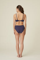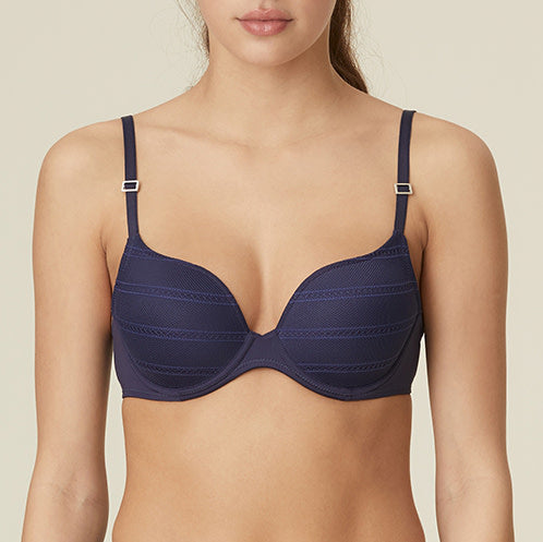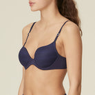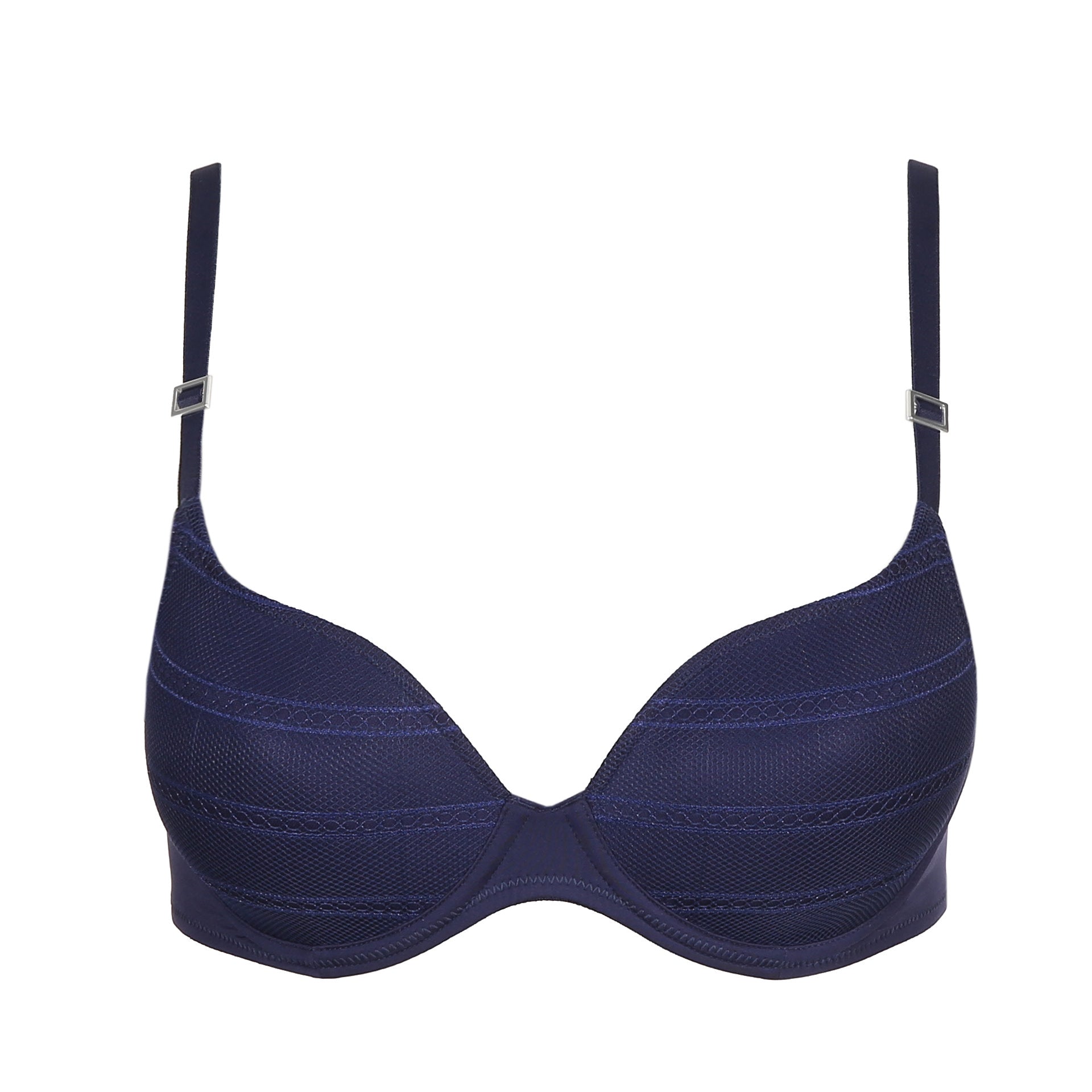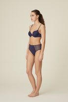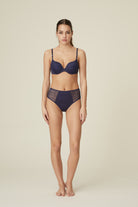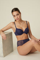 The cups of the bra are decorated with delicate lace. The details on the straps finishes the sophisticated look. Bleu Bijou is a stylish dark blue.