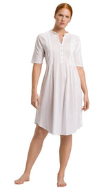Easy and practical, the HANRO Cotton Deluxe Short Sleeve Button Front Gown is tailored from 100% mercerized PIMA cotton, for incredible softness against the skin. Featuring a novel bigshirt styling, this knee-length nightgown has a partial button front with mother-of-pearl buttons, plus stylish raglan sleeves and a shirttail hemline. Flattering pleats at the Mandarin collar complete the look; combining a flattering, functional look with the versatility of wearing this nightgown to sleep in, or as loungewear.
