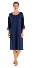 The Malene Collection, classic and feminine sleep styles offering a romantic look in 100% mercerized cotton. The silhouettes are adorned with a modern graphic embroidery motif. The 3/4 sleeve gown with its unique button Henley front and lace on the sleeve offers the perfect airy sleep piece on a warm night.
