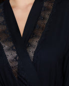 - Soft modal and lace short robe designed for sleep and loungewear.