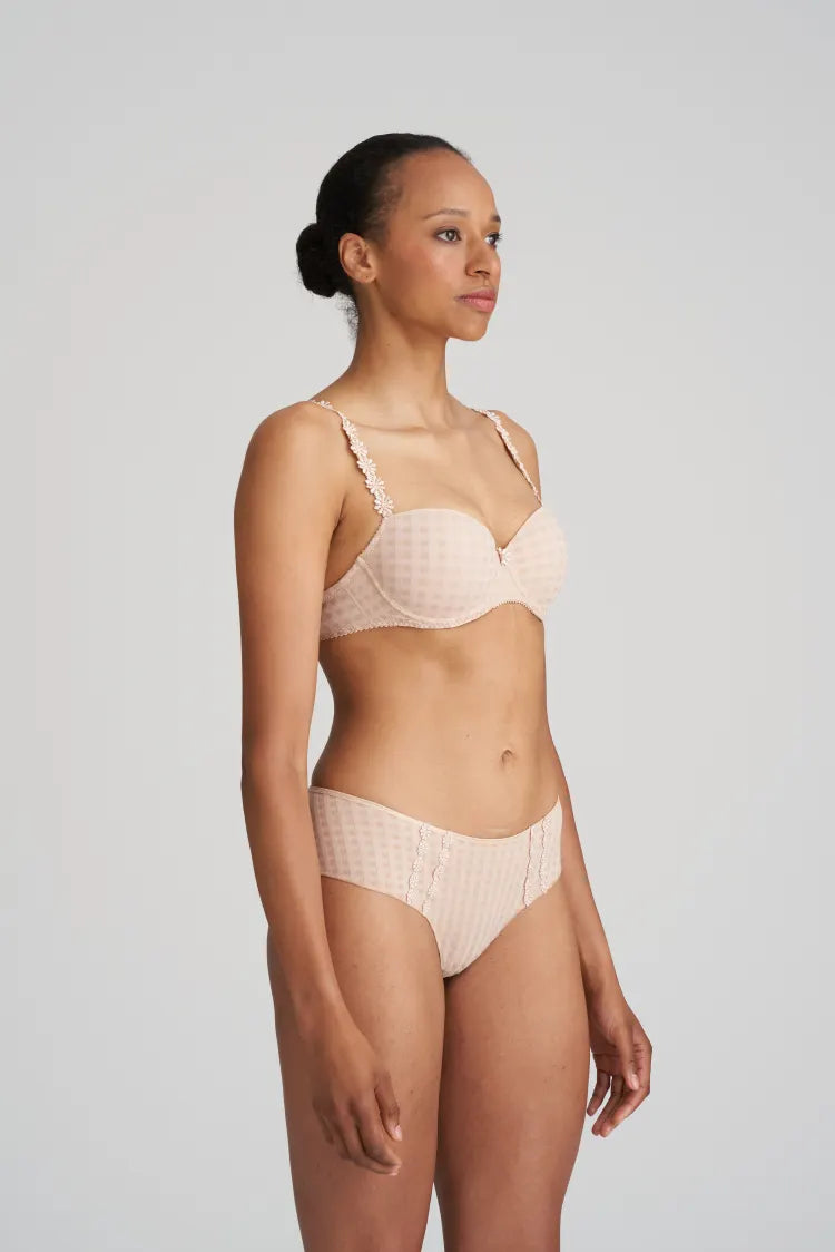 This highly coveted Avero Collection combines soft, subtle, checkered fabric with a beautiful embroidered lace and daisy motif. Pre-formed padded balconette bra. The centre panel between the breasts sits a little higher. Wear the straps over the shoulders or around the neck. Avero in Black is a real classic. Completely tone on tone to create a stylish look.