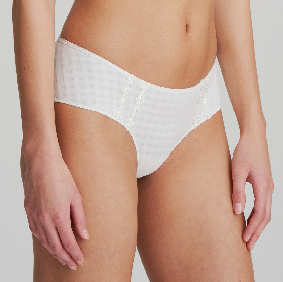 Hot pants have an elegant cut in the front like the Rio briefs and stop mid-bottom. These hot pants have a low rise. Completely opaque with two rows of Avero flowers in the front. You could say that Natural is the soft version of white. This hue flatters all skin tones and is simply perfect for brides. In Natural, the daisies and checks are beautifully tonal.