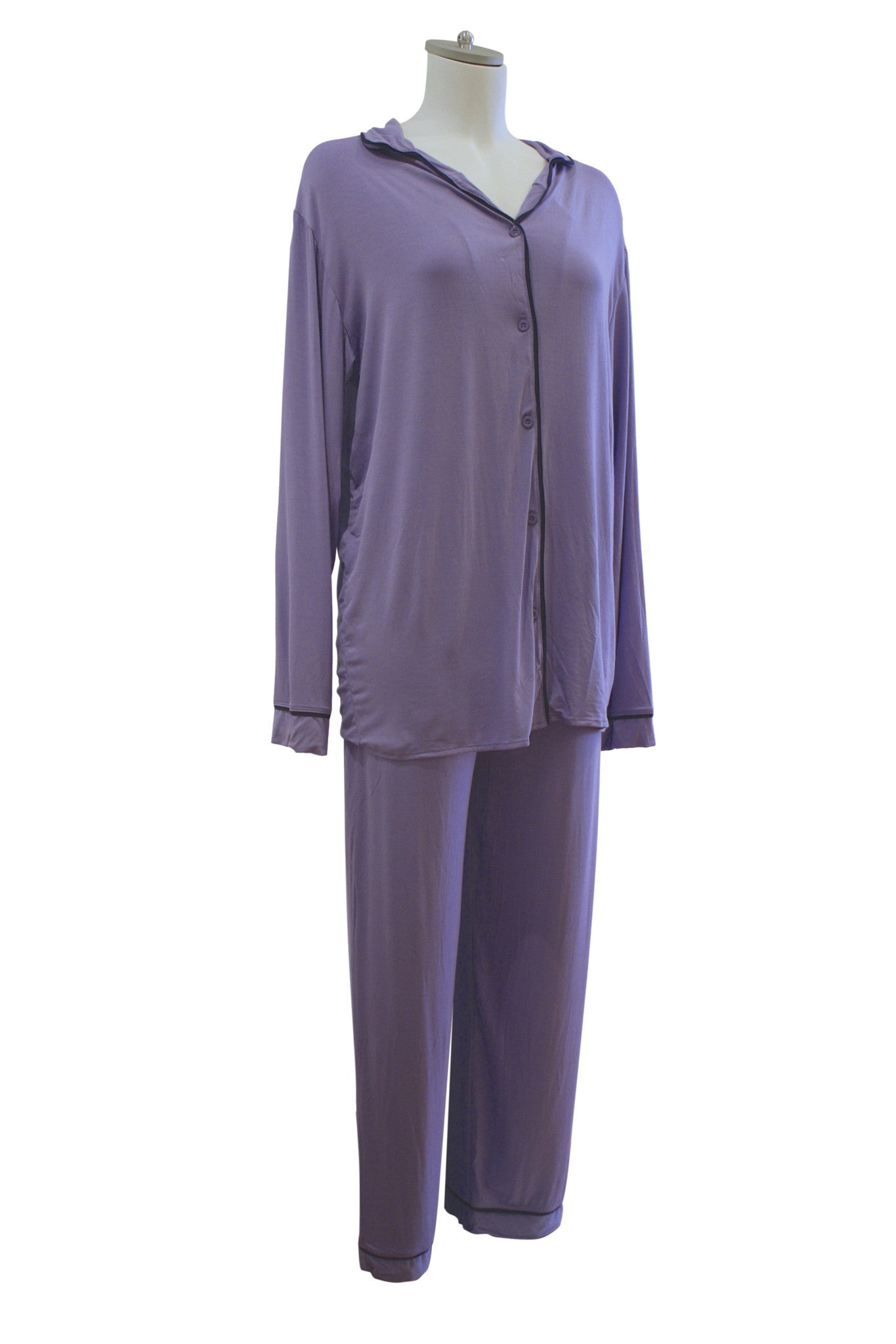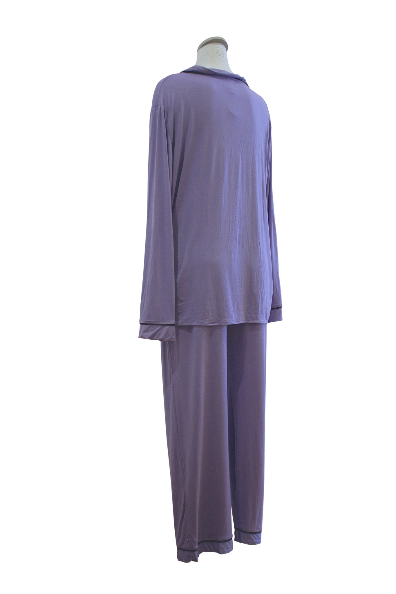 This men's style PJ set is extremely comfortable with breathable, stretchy, and soft material. Deep purple piping along the collar, front, wrists, and ankles. Button down front. Made of 100% bamboo. Imported. Wash with care
