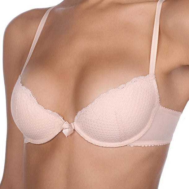 Lace overlays accent the molded underwire cups on a feminine bra, designed with smooth wings and a ribbon bow. Hook-and-eye closures and adjustable straps.