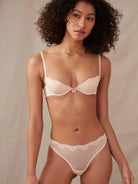Lace overlays accent the molded underwire cups on a feminine bra, designed with smooth wings and a ribbon bow. Hook-and-eye closures and adjustable straps.