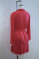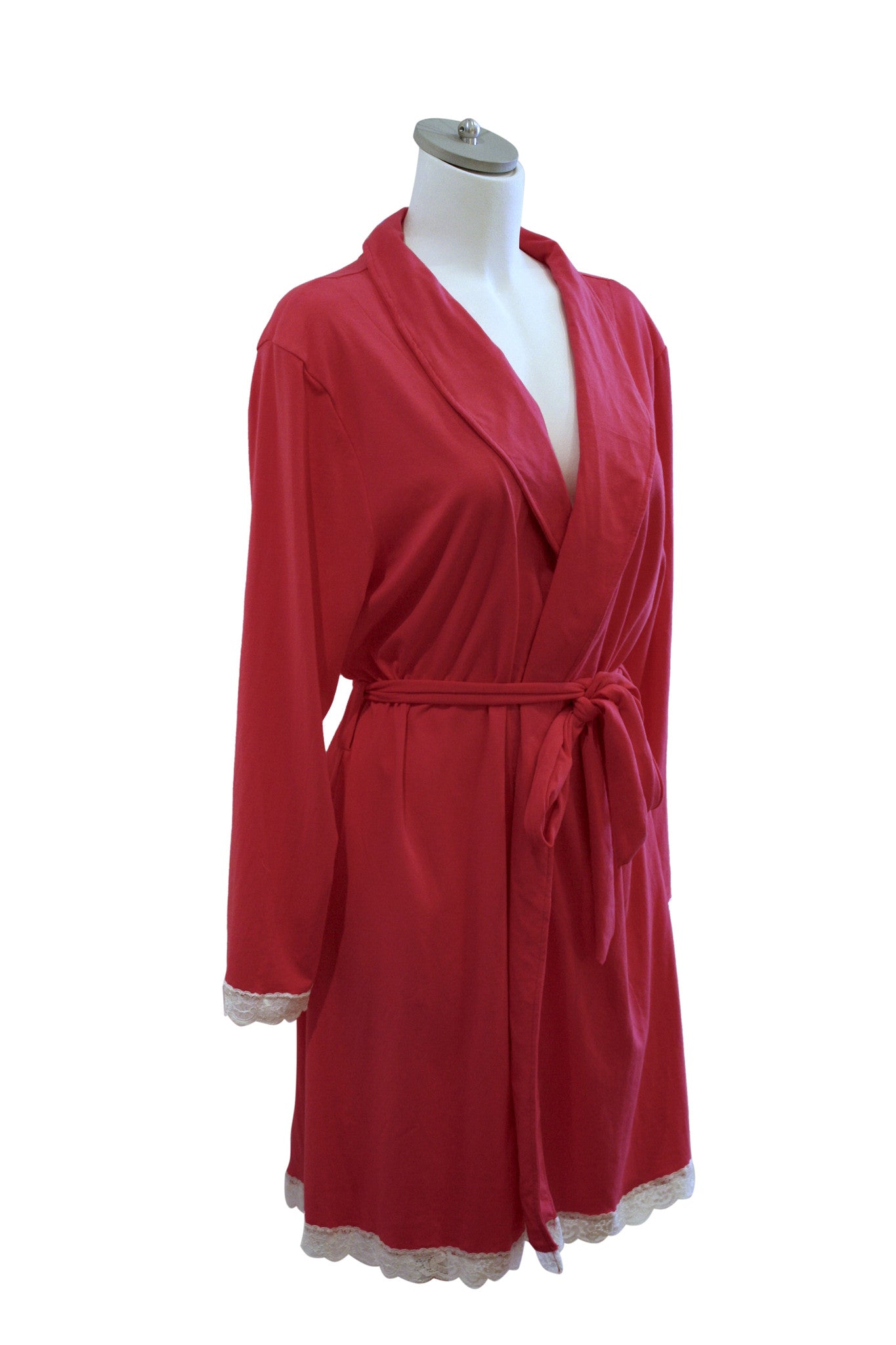 This robe is perfect for any season. Lightweight material is perfect for summer and great for layering in the winter. Lace trim on wrists and bottom hem. Arms hit at the wrist, bottom hem hits at the knees. Made of 48% cotton, 48% modal, and 4% spandex. Imported. Wash with care.
