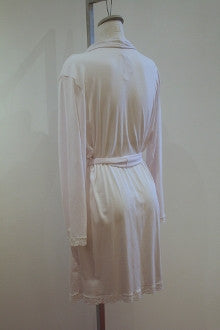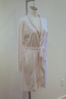 This robe is perfect for any season. Lightweight material is perfect for summer and great for layering in the winter. Lace trim on wrists and bottom hem. Arms hit at the wrist, bottom hem hits at the knees. Made of 48% cotton, 48% modal, and 4% spandex. Imported. Wash with care.