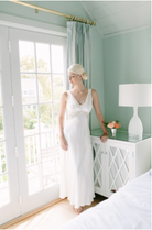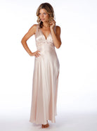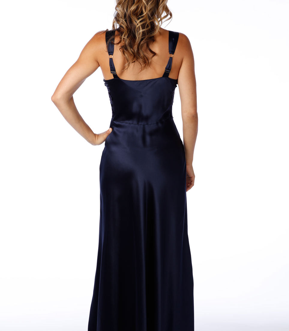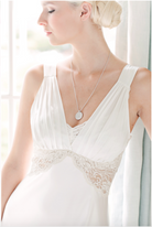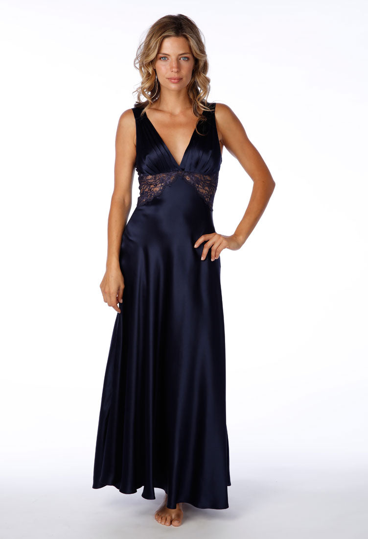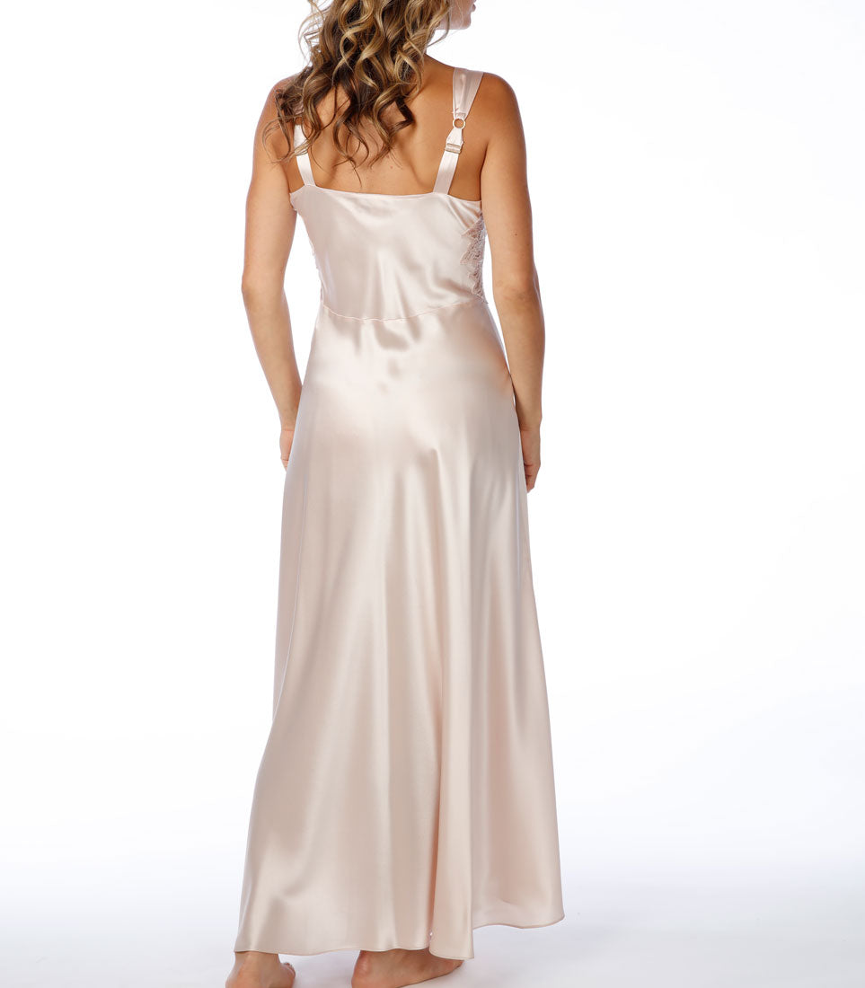 Reminiscent of Hollywood starlets, this beautiful gown is a favorite. This pure silk charmeuse is pleated over the bust to allow a fantastic fit for a full cup but also to flatter a smaller busted woman. The French stretch lace under the bust adds support and beauty. Adjustable straps.