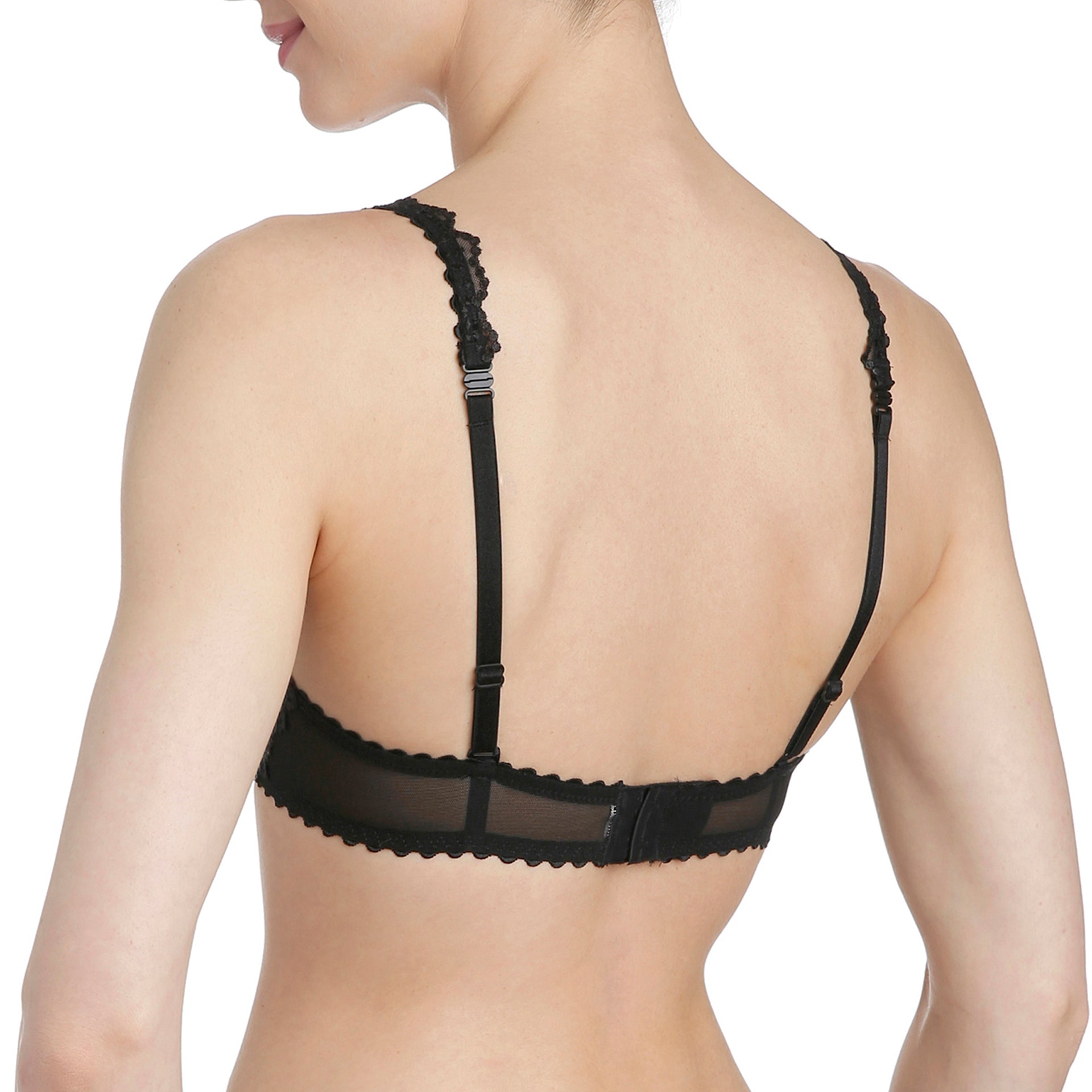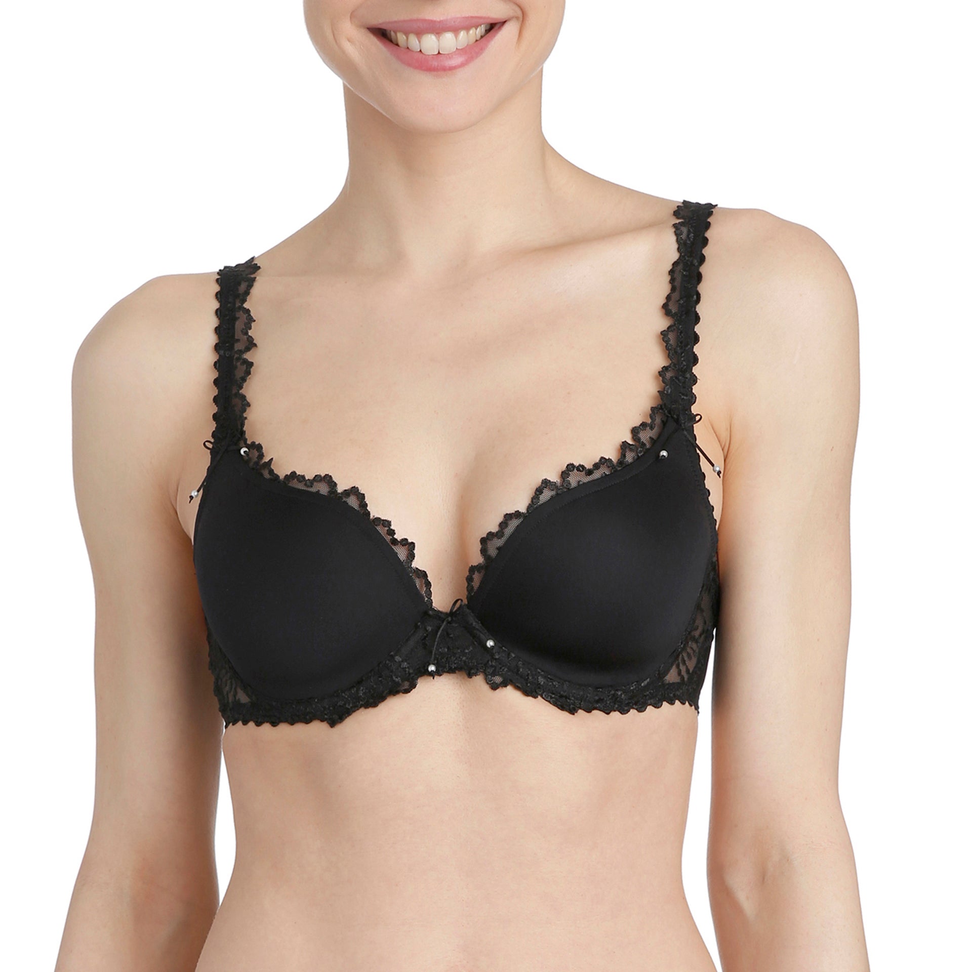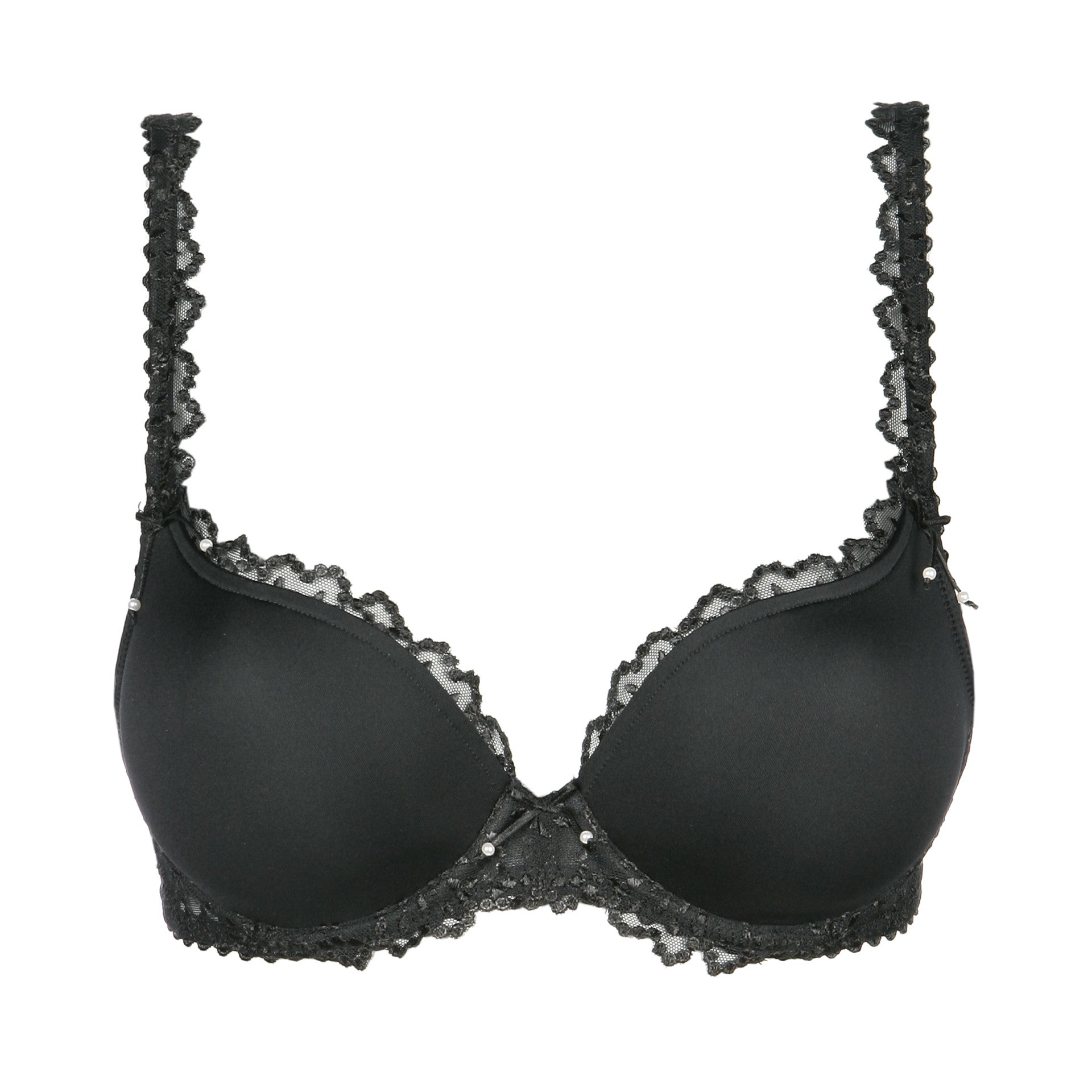 The cleavage created by the padded bra is the shape of a heart. The cup plunges in the centre and rises up on the sides to support the curve of the breast. The delicate embroidery that lines the top of the cup creates the perfect fit. There’s no more stylish colour than BLACK ... sophisticated and seductive.