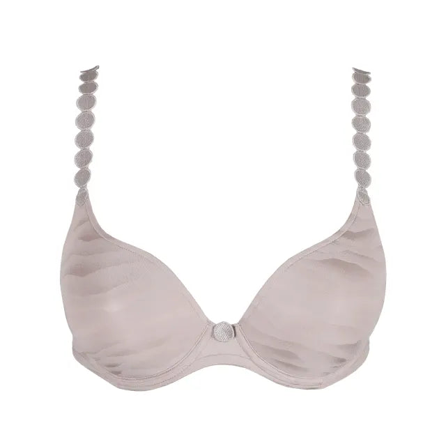 Contour/t-shirt bra has underwires that support the breasts for an even, smooth, rounded shape. Seamless cup is lightly padded for modesty. •Combines soft, subtle, fabric with beautiful dot appliques.