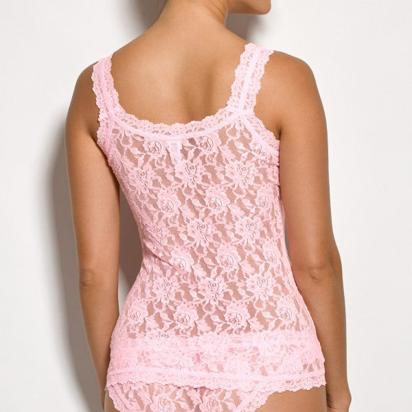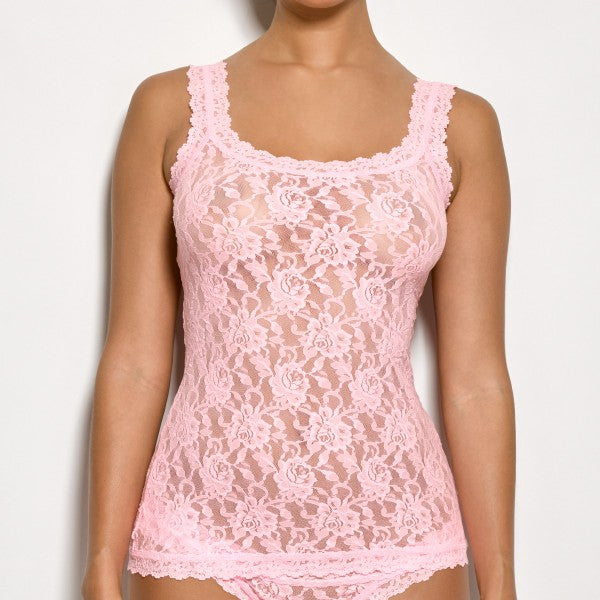 Unlined camisole in our signature stretch lace has wide, non adjustable straps and is approximately 24" long. Cami features scalloped lace trim at neckline and straps.
