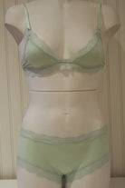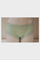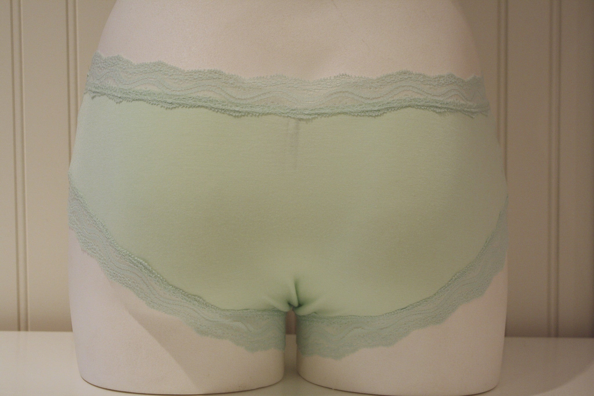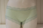 Super soft material and lace trim makes these incredibly comfortable girlshorts feminine and cute. These panties flatter everyone without riding up or showing lines. Matches the Mindy Bralet. Made of 95% modal and 5% spandex. Imported. Wash with care.